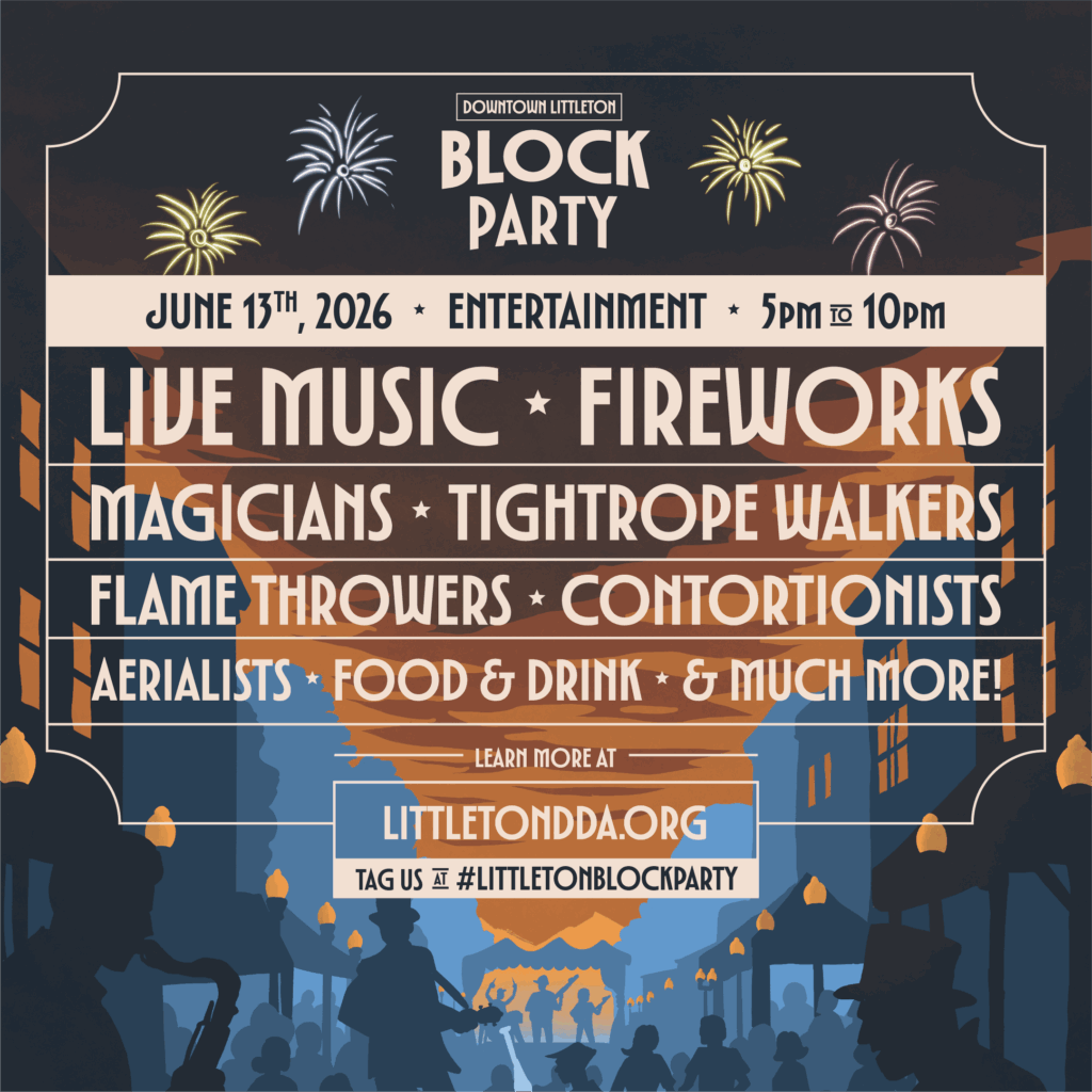 The Downtown Littleton Block Party is a not-to-be missed community favorite. Presented by the Littleton Downtown Development Authority with support from the City of Littleton and Visit Littleton, this FREE event kicks off the summer season in Downtown Littleton dazzling performances, live music, fiery spectacles, and a fireworks finale. Join us for an unforgettable night under the stars!