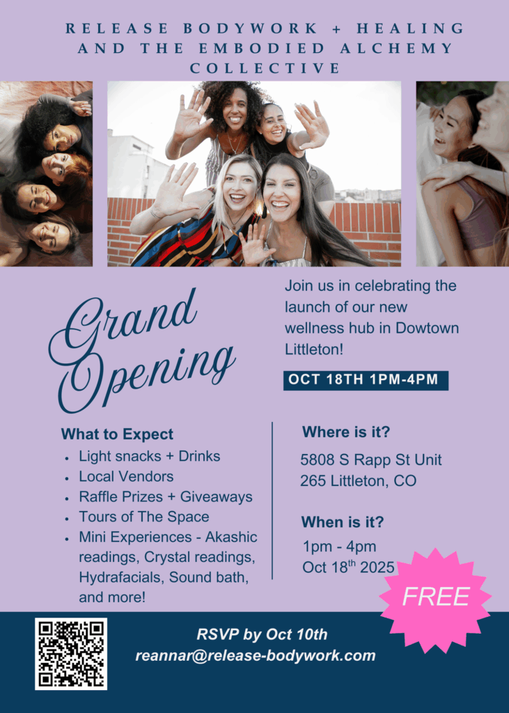 Come celebrate the grand opening of our new Wellness Center in downtown Littleton with bodywork and healing services – it’s going to be a blast!