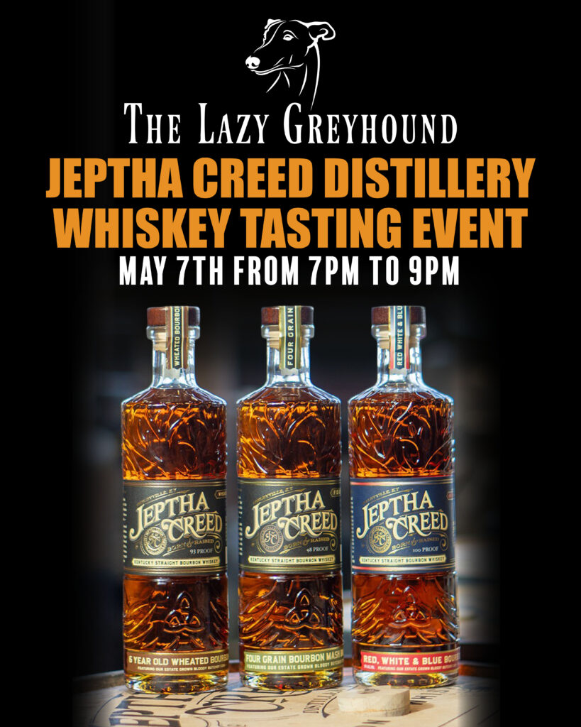 Join us at The Lazy Greyhound on Thursday May 7th for a whiskey tasting event with Jeptha Creed Distillers! We’ll have three different expressions of Jeptha Creed to taste with the distiller to explain the different processes and ingredients needed to make each one.