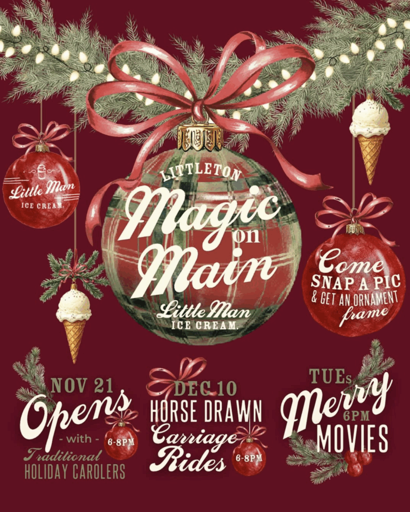Magic on Main arrives at Little Man Littleton on November 21, bringing classic carolers on opening night, cozy Merry Movies every Tuesday, and horse-drawn carriage rides on December 10th.