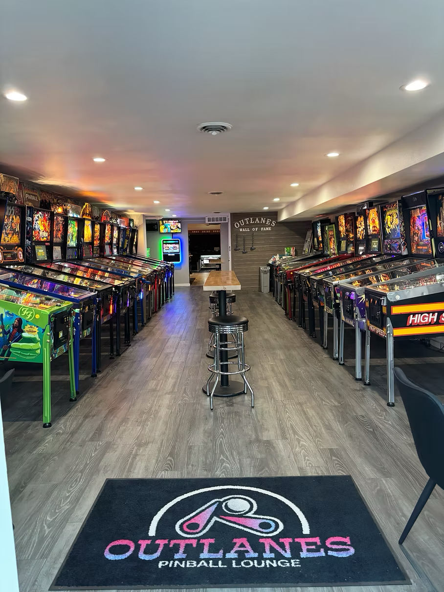 Pinball lovers rejoice! Outlanes houses 25–27 machines ranging from classic favorites to limited-edition treasures like James Bond 007. Run by passionate local couples, it also features leagues, tournaments, memberships, events—and they even have a liquor license and are now serving beer and wine!